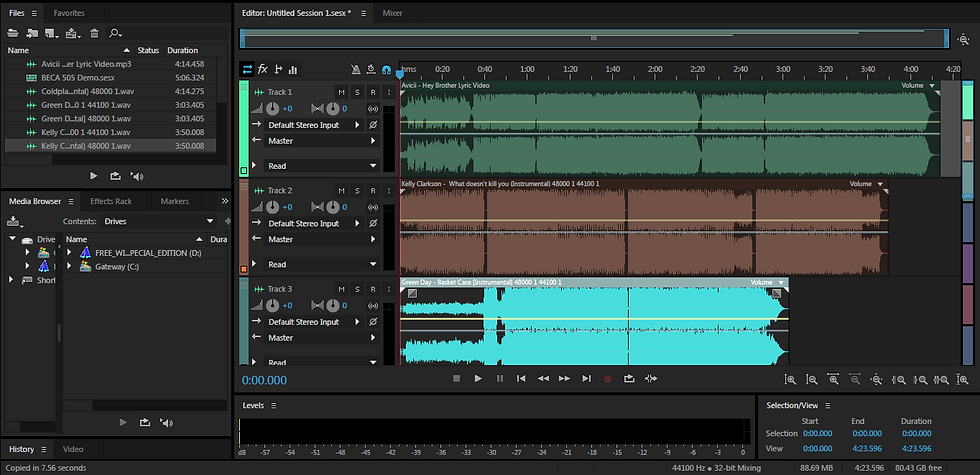 Step 3: After selecting your audio files they will appear in one session in different track sessions. They are color coordinated to differentiate the audio tracks.